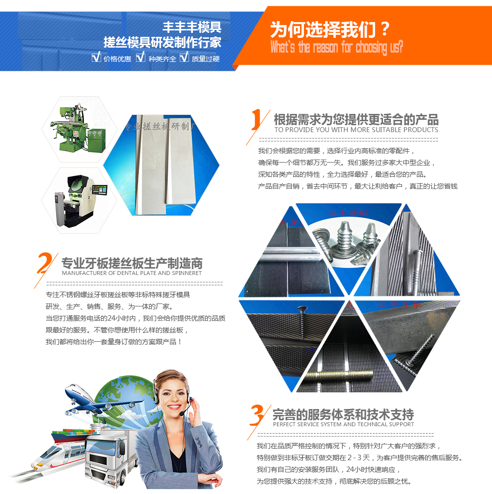 我們始終抱持著勤、誠、信的原則,致力于螺絲牙板、搓絲板產品專業廠商。多年來,由于全體同仁的勤奮、誠樸與使用客戶的支持與信任。造就三豐牙板品牌在業界樹立的良好形象,也建立了品質保證的優良信譽。勤、誠、信是三豐牙板全體同仁共同遵循的中心理念,更是我們服務客戶的宗旨。主營產品:不銹鋼搓絲板,不銹鋼機絲倒角切平牙板,D/W雙線單出(ss)墻用細牙搓絲板,機絲束桿圓尾牙板,機絲帶圈位螺絲牙板,高低牙自攻牙板,機絲帶溝五溝牙板,不銹鋼扭花紋搓絲板,牛仔釘牙板,直齒搓花板等搓絲模具。產品可滿足國標(GB)、德標(DIN)、美標(ANSI)、日標(JIS)、國際標準(ISO)等各種國際通用標準,并能根據客戶實際要求,設計訂做各種特殊非標規格...
